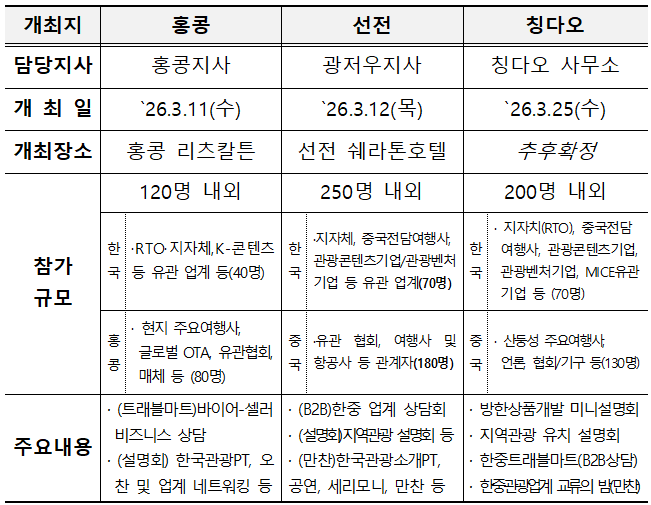 ㅇ 주요내용: 한-중화권 업계 B2B 상담, 한국관광 설명회 등