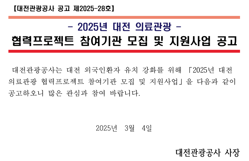 2025년 대전 의료관광 협력프로젝트 참여기관 모집 및 지원사업 공고 작성자대전의료관광관리자 게시 날짜 2025-03-04 조회수359 첨부파일(10) 2025년 대전 의료관광 협력프로젝트 참여기관 모집 및 지원사업 공고문.pdf [붙임1] 사업 신청서_2025 협력프로젝트.hwp [붙임2] 외국인환자 유치 매뉴얼 서식(에이전시)_2025 협력프로젝트.hwp [붙임2] 외국인환자 유치 매뉴얼 서식(의료기관)_2025 협력프로젝트.hwp [붙임3] 외국인환자 의료관광 지원금 신청서(에이전시)_2025 협력프로젝트.hwp [붙임3] 외국인환자 의료관광 지원금 신청서(의료기관)_2025 협력프로젝트.hwp [붙임4] 외국인환자 의료관광 지원금 지급 요청서(에이전시)_2025 협력프로젝트.hwp [붙임4] 외국인환자 의료관광 지원금 지급 요청서(의료기관)_2025 협력프로젝트.hwp [붙임5] 해외 홍보마케팅 지원금 신청서(의료기관, 에이전시)_2025 협력프로젝트.hwp [붙임6] 해외 홍보마케팅 지원금 지급 요청서(의료기관, 에이전시)_2025 협력프로젝트.hwp ※ 자세한 내용은 공고문 참조 ※ 문의: 대전관광공사 융합사업팀(042-250-1262) 이전글 2025년 대전 의료관광 활성화 1분기 워크숍 개최 안내 다음글 [한국관광산업포털] 2025 야쿠츠크 의료관광 박람회 참가기관 모집