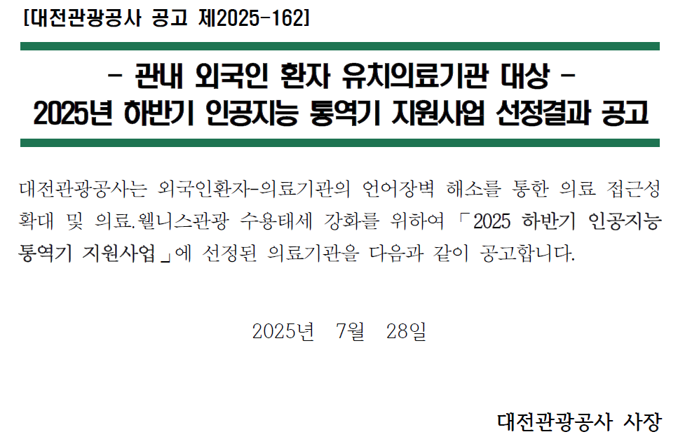 [대전관광공사 공고 제2025-162호] 2025년 하반기 인공지능 통역기 지원사업 선정결과 공고 작성자대전의료관광관리자 게시 날짜 2025-07-28 조회수136 첨부파일(1) [붙임1]2025 관내 외국인 환자 유치의료기관 대상 인공지능 통역기 지원사업 선정 결과.pdf ° 관련문의: 042-250-1262 이전글 [한국관광산업포털] 2025 일본 도쿄‧오사카 코리아 뷰티&메디컬 페어 행사 참가모집 다음글 [한국관광산업포털] 2025 하반기 중동지역 주요 관광 박람회 및 K-관광 로드쇼 참가기관 모집