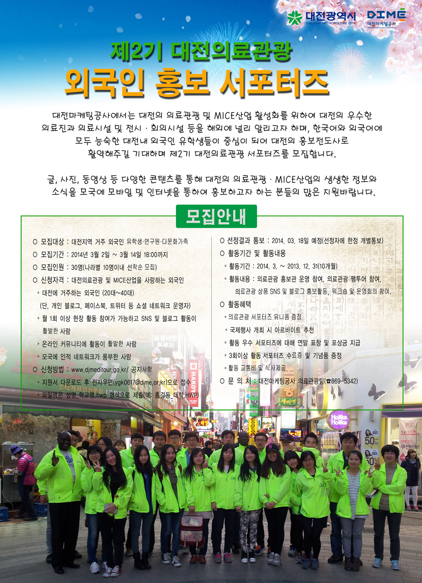 제2기 대전의료관광 서포터즈 모집 작성자관리자 게시 날짜 2014-03-04 조회수2575 첨부파일(3) 서포터즈-모집(중국어).jpg 제2기 대전의료관광 서포터즈 지원서.hwp 서포터즈 모집(영어).jpg 이전글 염 시장, 시애틀시와 향후 25년 협력 다져 다음글 2014 대전의료관광 해외마케팅 시범사업 공고