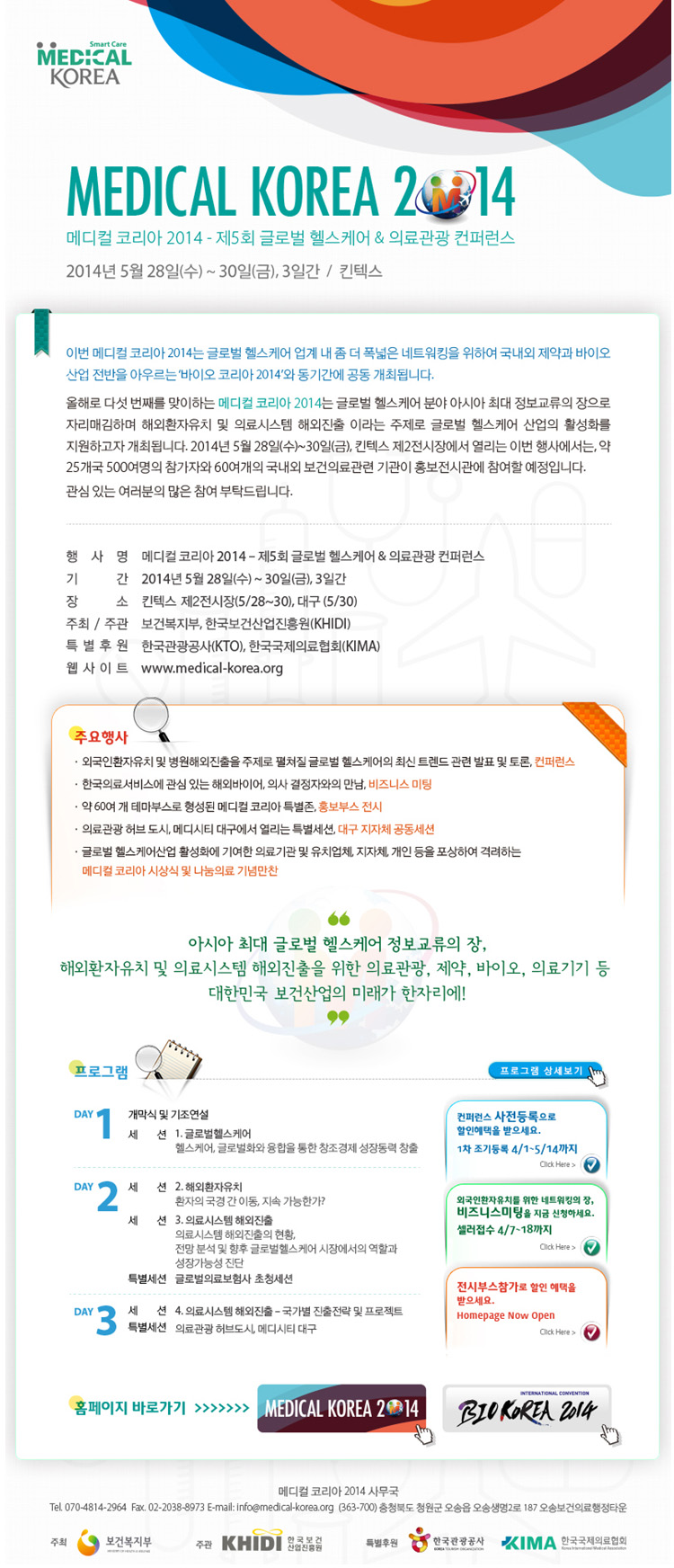 2014 메디컬 코리아 제5회 글로벌 헬스케어&의료관광 컨퍼런스 작성자관리자 게시 날짜 2014-04-29 조회수2208 이전글 “높은 의료수준·저렴한 가격에 반했어요” 다음글 예산군 의료관광 팸투어 해외 관광객에 호평
