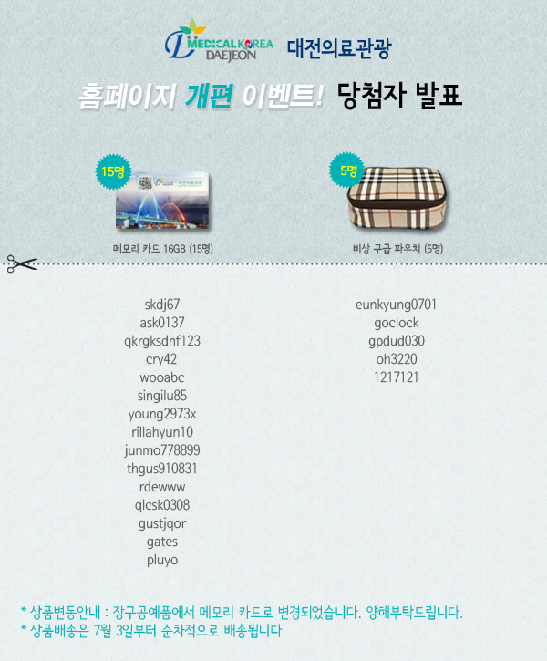 대전의료관광 홈페이지 개편 이벤트 당첨자 발표! 작성자관리자 게시 날짜 2014-07-01 조회수2240 이전글 예산군, 러시아청소년 대상 K-Farm 체험캠프 진행 다음글 K-FARM 농촌체험 의료관광 글로벌 전문인력양성 교육기관 선정 공모(긴급)