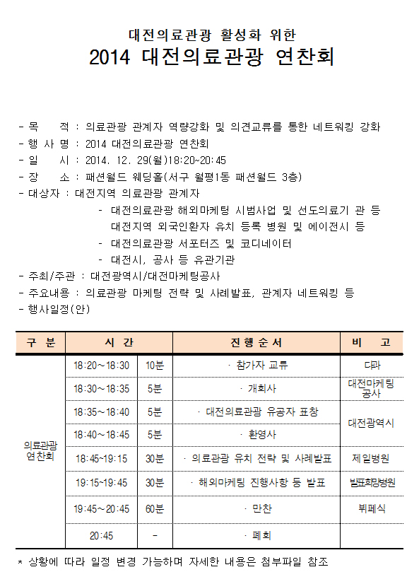 2014 대전의료관광 연찬회 안내 작성자관리자 게시 날짜 2014-12-19 조회수2011 첨부파일(1) 2014 대전의료관광 연찬회.hwp 이전글 대전의료관광 홈페이지 관리 기간제 근로자 채용공고 다음글 대전시, 의료관광 홍보설명회 개최