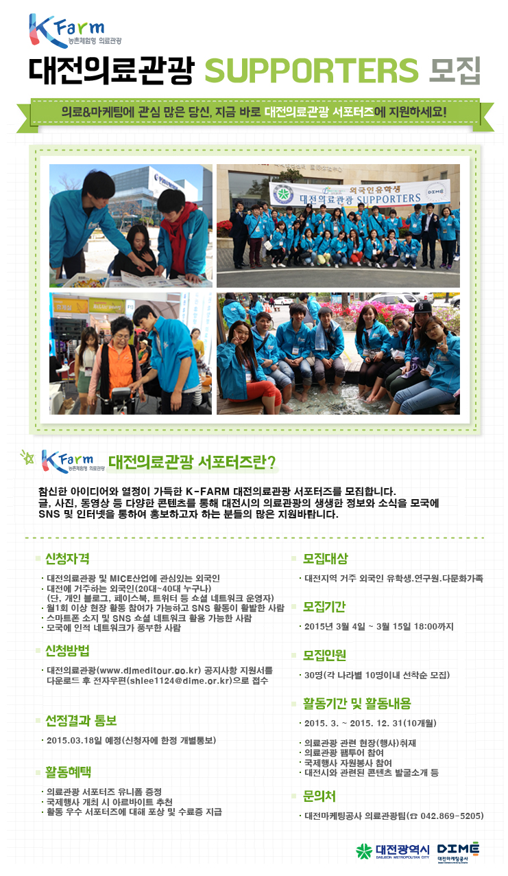 K-FARM 대전의료관광 서포터즈 모집 작성자관리자 게시 날짜 2015-03-02 조회수2041 첨부파일(1) 서포터즈 지원서.docx 이전글 대전시, 외국바이어와 의료관광객 유치 계약 다음글 2015 Medical Korea