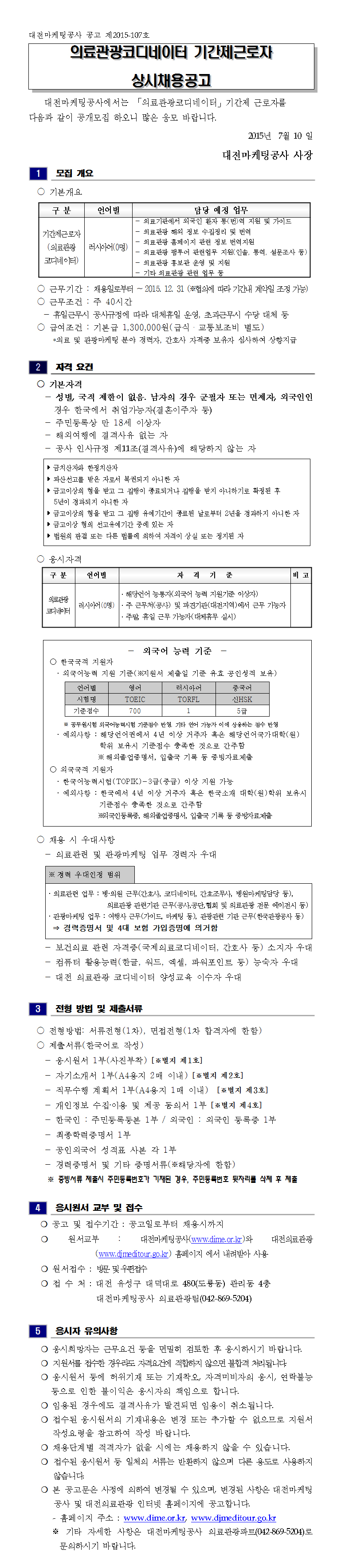 대전의료관광코디네이터 기간제근로자 상시 채용 공고 작성자관리자 게시 날짜 2015-07-10 조회수2899 첨부파일(1) 2015 의료관광 코디네이터 채용공고(상시채용).hwp 이전글 대전의료관광코디네이터 기간제근로자 채용 공고 다음글 대전 동춘당 찾은 외국인 관광객